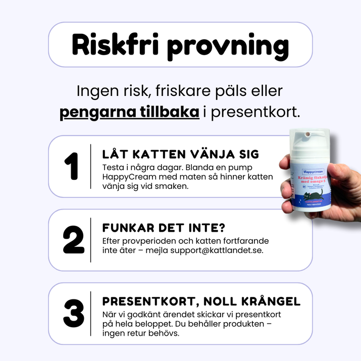 Om din katt efter rimligt försök fortfarande inte vill äta HappyCream™ – trots att du försökt flera gånger – så får du ett presentkort på hela beloppet.