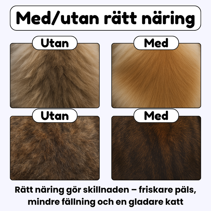 - Taurin och mineraler som förbättrar pälskvaliteten