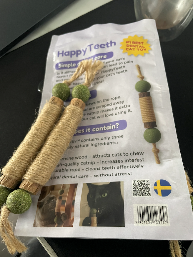 Ja, HappyTeeth är helt naturlig och fri från tillsatser. Själva pinnen är gjord av silvervine-trä och på sidorna sitter små bollar av kattmynta. Kombinationen gör den både lockande och trygg. Katten tuggar samtidigt som tänderna rengörs.