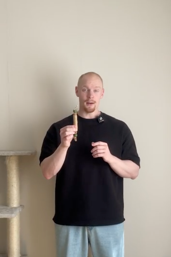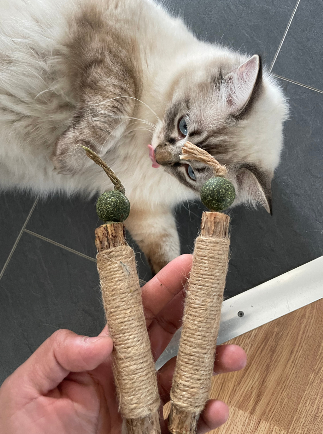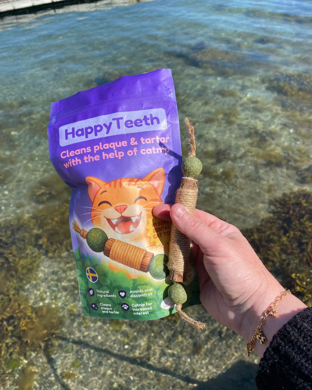 HappyTeeth kombinerar kattmynta + silvervine så katten vill tugga – och repen hjälper till att skrapa bort plack.